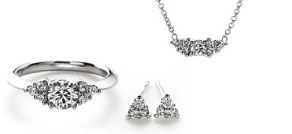配鑽上沒有座台更顯俐落印象,中央鑽石座颱飽滿可愛的形狀,鑽鍊.鑽石耳環以及訂婚鑽戒都是同款設計。 鑽石耳環可左右晃動的搖曳款式。
